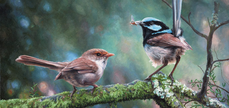 ‘Spring’ – Superb Fairy Wrens Posted on November 5, 2020November 5, 2020 by Liz Cogley A little gem in the Australian bush Oil on Board Size 36 x 25 cm For Sale Prints are available here